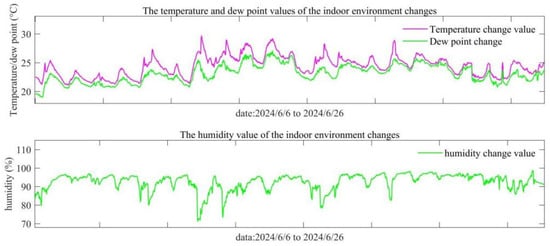 According to the indoor sensor data, the breeding environment for pigs was generally suitable. The average temperature during the experiment was 24.15 °C, the average humidity was 91.27%, and the average dew point was 22.63 °C. The highest recorded temperature was 29.67 °C, while the lowest was 18.98 °C, as illustrated in Figure 11.