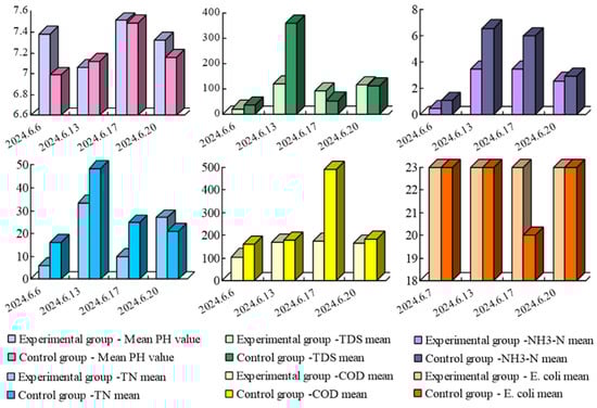 To ensure the positive influence of water quality on pigs, conducting regular water quality analyses is crucial. Through these analyses, breeders can promptly identify and address any water quality issues, thereby ensuring that pigs have access to sufficient and high-quality water resources. This practice not only maintains the health of the pigs but also significantly enhances farming efficiency. During a twenty-one-day test period, we selected four days for the comprehensive water quality index analysis. To ensure the accuracy and representativeness of our data. We used the TRIMMEAN function to first remove the extreme outliers from the data set, and then averaged the remaining data to represent the water quality conditions of the experimental and control groups [32]. This approach minimizes errors caused by outliers, making our analysis results more consistent and reliable.