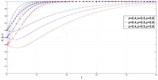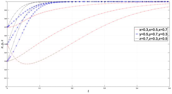 Furthermore, on the assumption that the variables and parameters remain constant and considering the varying and distinct initial willingness levels of the three participants, the simulation is conducted in three distinct scenarios: z > y > x, y > x > z, and x > z > y. Figure 3 shows the simulation of the collaborative evolution of the three players when their willingness to collaborate is (0.3,0.5,0.7), (0.5,0.7,0.3), and (0.7,0.3,0.5), respectively. As shown in Figure 4, when the willingness to collaborate of the three players changes to different levels, the willingness to collaborate converges to 1 and eventually tends to the stable point (1,1,1). Although the willingness to collaborate of the three players varies, the willingness to collaborate of the new agricultural business entities and rural households directly increases and quickly converges to 1. The willingness to collaborate of the village-level administrative organizations also eventually converges to 1, but the convergence speed is significantly slower. When the willingness to collaborate is (0.5,0.7,0.3), the willingness to collaborate of the village-level administrative organizations initially decreases. However, as the willingness to collaborate of the new agricultural business entities and rural households rapidly increases, the willingness to collaborate of the village-level administrative organizations also begins to rise.