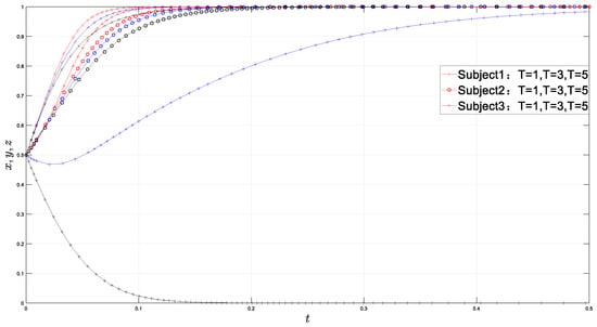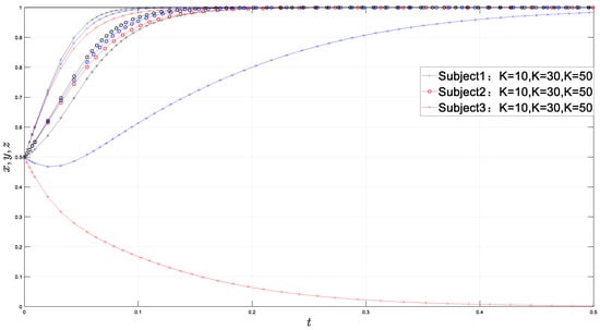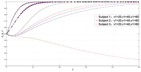 Assuming that the variables and parameters remain constant, it may be inferred that the initial willingness of the three subjects is equivalent, denoted as x = y = z. Figure 3 depicts the simulation of the combined development of the three subjects when their willingness to collaborate reaches values of 0.4, 0.5, and 0.6. Figure 1 illustrates that when the combined willingness of the three subjects increases simultaneously, decreases simultaneously, and remains at a moderate level, the combined willingness of x, y, and z all approach 1 and ultimately converge to the stabilization point (1,1,1). The willingness to collaborate of new agricultural business entities and peasant households exhibits a rapid increase across the three levels. Conversely, the willingness to collaborate of village administrative organizations experiences a brief initial decrease, followed by a subsequent rise and convergence to 1. However, the rate of convergence for the latter is comparatively slower.