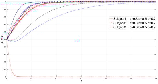Evolution results of changes in benefit allocation proportion coefficient b. The three lines represent three entities respectively, as shown in the legend. Different colors represent different probabilities or variable values, as shown on the vertical axis.
