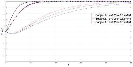 Figure 9 shows the simulation of the impact of changes in cost sharing ratio coefficient e on the collaboration willingness of the three players in digital governance, assuming other variables and parameters remain unchanged. As can be seen from Figure 8, changes in cost sharing ratio coefficient e have almost no impact on the collaboration willingness of new agricultural business entities and farmers. The collaboration willingness of both players converges to 1 at an unchanged rate. The collaboration willingness of village-level administrative organizations is also not sensitive to changes in parameter e. When parameter e increases, the collaboration willingness of village-level administrative organizations also rises at a faster rate and converges to 1, but the degree of change in convergence rate is very small. The reason is that the total cost of farmers choosing to collaborate is relatively small (how the two players share the cost will not affect the collaboration willingness of farmers) and only has a slight impact on the collaboration willingness of village-level administrative organizations.