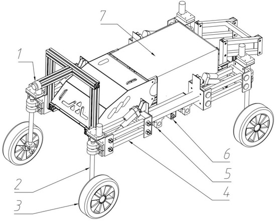 - This study designed a parameter-adaptive platform based on an independent pillar leg type, using dual parallelogram mechanisms to achieve the synchronous adjustment of the chassis ground clearance and wheelbase, using dual lead screw mechanisms to achieve the symmetrical adjustment of the wheelbase and using a leg pillar design to achieve the independent driving and steering of all four wheels. The results show that the platform has a maximum ground clearance adjustment range of 252–359 mm, a maximum wheelbase adjustment range of 700–850 mm, and strong obstacle-crossing capabilities based on soil ridges.