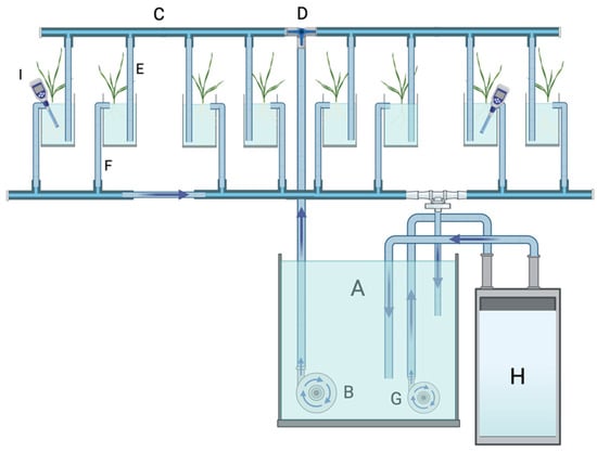 Simplified diagram of the hydroponic system designed for this study. Nutrient solution contained in a 60L tank (A) is pumped (B) to a 4-outlet manifold (C) via a “T” connector (D) with a flow-controlling valve. Outlets of the manifold were plugged into Teflon flexible tubes (E) that delivered nutrient solution to 1 L pots containing plants. Each pot was provided with an overflow drainage system consisting of a flexible Teflon tube (F) inserted in a small hole drilled at 1 cm below the pot upper border that drained back to A. A second pump (G) circulated the nutrient solution from A to a temperature control system (H) and back to A. Thermometers (I) were inserted in randomly selected pots to monitor the temperature. The system depicted in the figure is the one used in experiment 2. For experiment 1, plastic boxes 36.5 cm long, 26.5 cm wide, and 11.5 cm deep were used, in which PVC cylinders 9 cm long and 3.5 cm in internal diameter were inserted.
