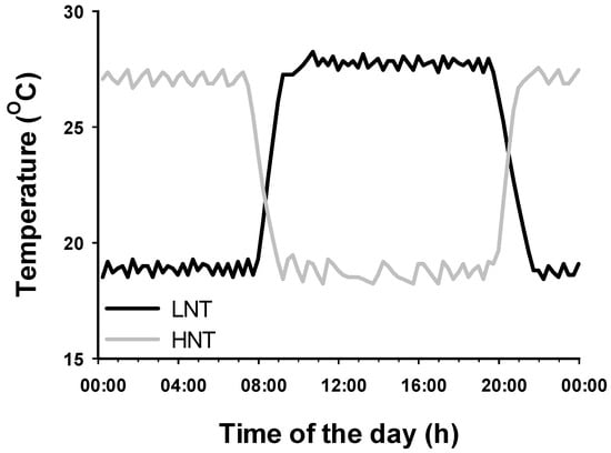The hydroponic system used in this study is shown in Figure 1. The nutrient solution flowed from a 60 L tank to the pots/boxes containing the plants by means of a 350 W pump (Eheim GmbH, Deizisau, Germany, 10 L min−1 capacity) connected to two 4-outlet manifolds linked to each other via a T connector including a flow controlling valve. To each outlet a 1 cm i.d. Teflon tube was tightly connected and immersed into either 1 L capacity square plastic pots or plastic boxes in which PVC cylinders were inserted (see below). The flow-controlling valve was adjusted to provide a flow rate of 0.5 L min−1. Each pot/box had an overflow outlet located 1 cm below the border connected to an “L” connector and Teflon tube that drained back to the 60 L tank. A second pump (150 W) was connected to the temperature control systems (Teco, TR/TC 10, Croydon, UK). This pump took nutrient solution from the 60 L tank and passed it through the temperature control system and back to the 60 L tank. Temperature sensors connected to TinyTag data loggers (Chichester, UK) were inserted into randomly selected pots/boxes to monitor temperature in the nutrient solution and adjust the settings of the temperature controlling system. Temperatures were targeted at 28 °C (day) and 18 °C (night), this regime was denoted as low night temperature (LNTu and 18 °C (day) and 28 °C (night), denoted as high night temperature HNT. The typical day–night water temperature profile is shown in Figure 2.