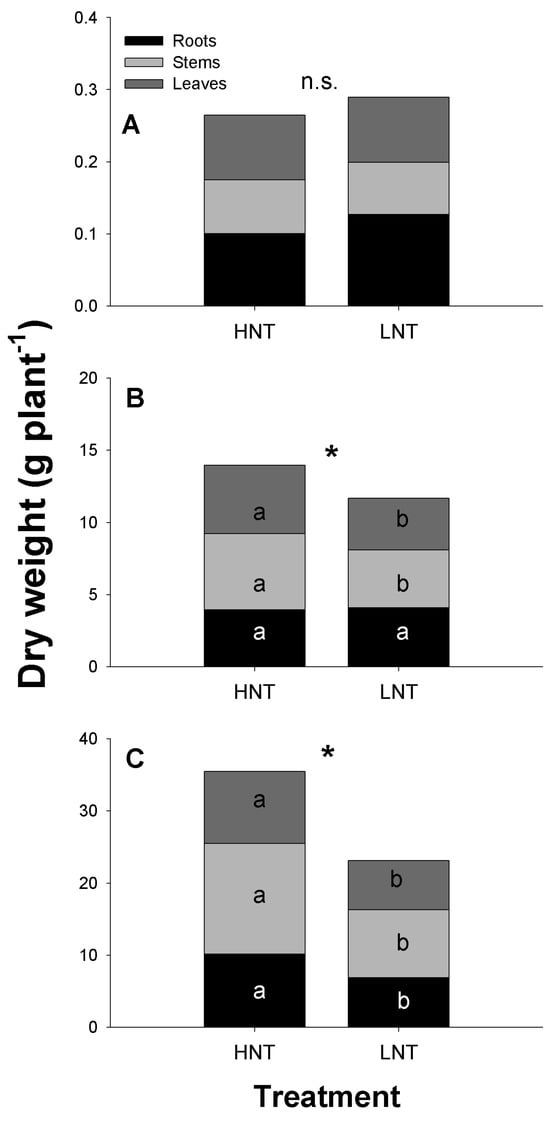 Total and organ dry weight of rice plants cv. IR64 subjected to high (HNT) or low (LNT) night root and meristem temperature for different lengths of time. (A): experiment 1, 7 days after treatment (dat); (B): experiment 2, 16 dat; and (C): 28 dat. Data were analysed by a two-way ANOVA with time after treatment, and root and meristem night-time temperature as main factors. When factors were statistically significant, the post-hoc Tukey test was performed. * Indicates significant differences in total and organ plant biomass due to root and meristem night-time temperature at p < 0.05, and n.s. indicates not significant at p < 0.05. Plant organs of different treatments labelled with different letters are statistically significant at p < 0.05.