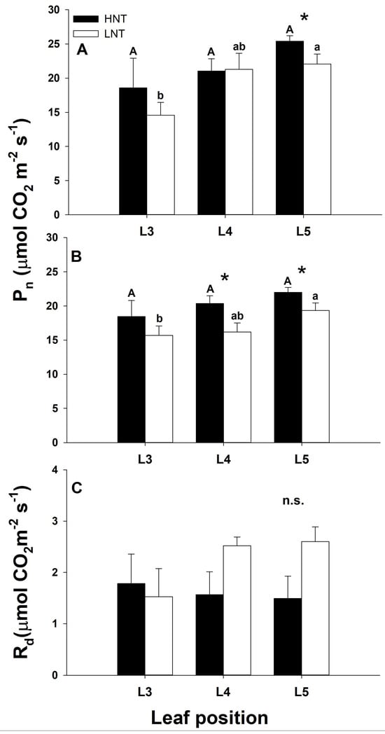 Rates of photosynthesis measured at a photosynthetic photon flux density of 2000 μmol m−2 s−1, and 400 μmol mol−1 CO2 in leaves of different ages from rice plants cv. IR64 subjected to high (HNT) or low (LNT) root and meristem night-time temperature (RMT) during the night for different lengths of time in experiment 2. (A): 16 days after treatment (dat); (B): 28 dat; (C): day respiration rates in leaves of different ages subjected to the treatments for 28 dat. Data were analysed using a two-way ANOVA with leaf age and RMT as main factors. When factors were statistically significant, the post-hoc Tukey test was performed. * Indicates significant differences at p < 0.05 between leaves of the same age from different RMT. Leaves of different ages within the same treatment and the same letter are not statistically significant at p < 0.05. n.s. indicates not statistically significant at p < 0.05. Uppercase letters: HNT; lowercase letters: LNT.