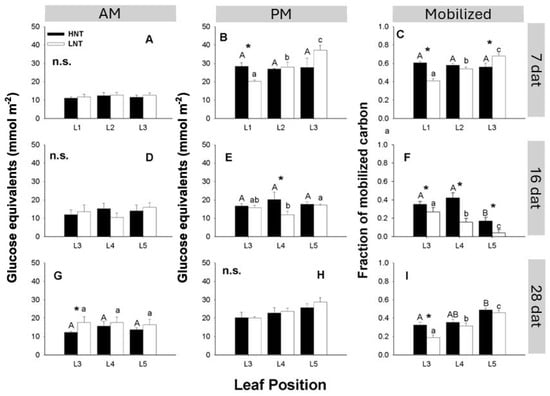 Minimum soluble carbohydrate concentrations (taken at the end of the night period) were not affected by the RMT regime nor by leaf age (Figure 5A,D,G); only L3 of plants grown under the LNT 28 dat (Figure 5G) had higher soluble carbohydrate concentrations than the corresponding leaf from HNT plants. In the middle of the photoperiod, HNT increased soluble carbohydrates at 7 dat in L1 and at 16 dat in L4 (Figure 5B,E). In plants exposed to LNT for 7 days, there was a clear gradient of carbohydrate concentration, with older leaves showing less soluble carbohydrates than younger leaves (Figure 5B), whereas in HNT plants, all leaves had similar carbohydrate concentrations. In successive sampling dates, little differences were detected due to either night RMT or to leaf age. Calculating the fraction of accumulated carbohydrates mobilised during the night (Figure 5C,F,I) showed that leaves from the HNT treatment exported a larger fraction of accumulated carbon (58%, 7 dat; 31%, 16 dat; and 39%, 28 dat) compared to 54%, 15%, and 32% in LNT plants, 7, 16, and 28 dat, respectively. The oldest leaf of HNT plants (L1, 7 dat or L3, 16 and 28 dat) consistently exported a larger fraction of accumulated carbon than the corresponding leaf of LNT plants.