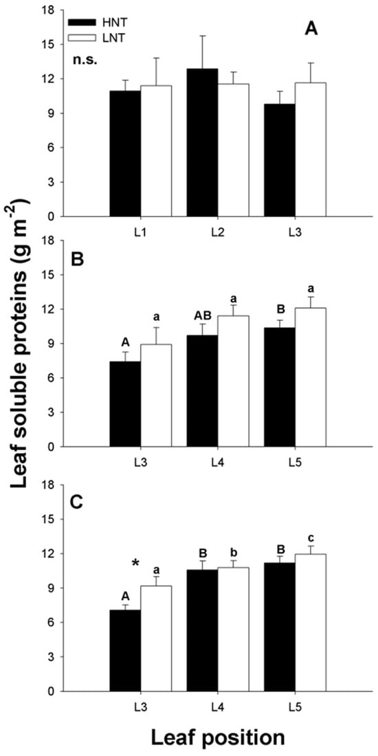 Soluble protein concentration in leaves of different ages from rice plants cv. IR64 subjected to high (HNT) or low (LNT) root and meristem temperature (RMT) during the night for different lengths of time. (A): Experiment 1, 7 days after transplant (dat); (B): experiment 2, 16 dat; and (C): experiment 2, 28 dat. Data were analysed using a two-way ANOVA with leaf age and RMT as main factors. When factors were statistically significant, the post-hoc Tukey test was performed. * Indicates significant differences at p < 0.05, between leaves of the same age from different RMT treatments. n.s. indicates not statistically significant at p < 0.05. Leaves of different age within the same treatment and the same letter are not statistically significant at p < 0.05. Uppercase letters: HNT; lowercase letters: LNT.