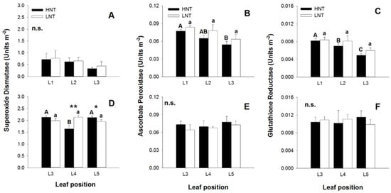 Activities of Superoxide Dismutase (A,D), Ascorbate Peroxidase (B,E) and Glutathione Reductase (C,F) determined in leaves of different ages from rice plants cv. IR64 subjected to high (HNT) or low (LNT) root and meristem temperature (RMT) during the night for different lengths of time. One unit is defined as 1 μmol min−1. Upper panel: experiment 1, 7 days after treatment (dat); lower panel: experiment 2, 16 dat. Data were analysed using a two-way ANOVA with leaf age and RMT as main factors. When factors were statistically significant, the post-hoc Tukey test was performed. ** Indicates significant differences at p < 0.01, between leaves of the same age from different RMT treatments. * Indicates significant differences at p < 0.05, between leaves of the same age from different RMT treatments. n.s. indicates not statistically significant at p < 0.05. Leaves of different ages within the same treatment and the same letter are not statistically significant at p < 0.05. Uppercase letters: HNT; lowercase letters: LNT.