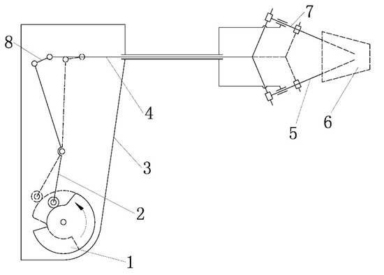 Structure of the picking arm. 1. Cam, 2. fork, 3. picking arm casing, 4. push rod, 5. seedling needle I, 6. plug tray, 7. Seedling Needle II, 8. connecting rod.