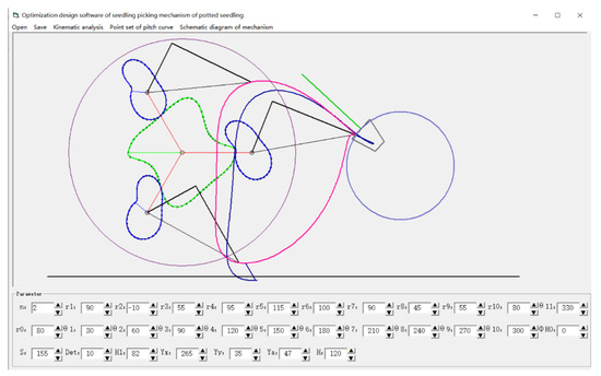 Based on the kinematic model of the vegetable hole tray seedling-picking mechanism established in Section 2.2, this study developed an optimization design software for the seedling-picking mechanism, as shown in Figure 4. The software includes several parts, such as the menu bar, graphic display area, and parameter area. The parameter area includes all variable parameters of the seedling-picking mechanism. In the graphic display area, the software can display the working trajectory of the seedling-picking mechanism in real time based on the changes in the mechanism parameters, and can intuitively display the motion of the seedling-picking mechanism, including relative motion trajectory and absolute motion trajectory. Click the save button in the menu bar to save the parameters in the parameter area as a .dat format file; click the open button in the menu bar to open the saved .dat file and display the trajectory in the graphic display area; click on the node curve point set in the menu bar to save the node curve point set of non-circular center wheels in .dat format; click on the mechanism schematic in the menu bar to save the mechanism schematic of this transplanting mechanism in DWG format.