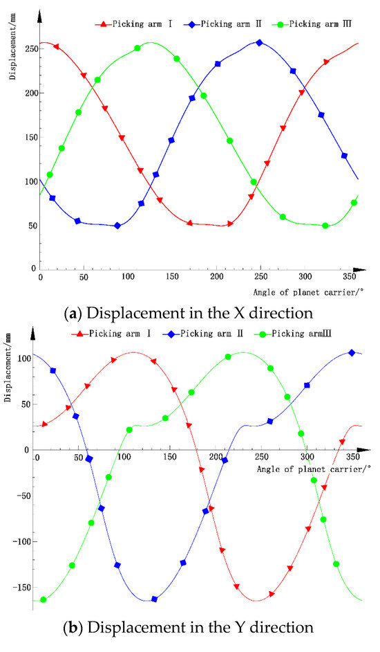 Under optimized mechanism parameters, the displacement curve of the picking arm endpoint, as it rotates with the planet carrier, is shown in Figure 6. In the X direction, the maximum displacement of the picking arm endpoint is 256.94 mm, and the minimum displacement is 49.87 mm. In the Y direction, the maximum displacement of the picking arm endpoint is 106.49 mm, and the minimum displacement is −164.93 mm. The picking arm endpoint achieves the seedling-picking trajectory between the maximum and minimum displacements, picking seedlings at the trajectory point (256.92, 26.25) and feeding seedlings at the trajectory point (93.96, −164.93).