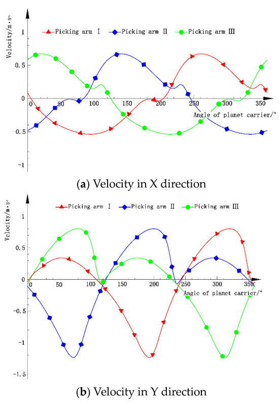 Under optimized parameters, the velocity curve of the picking arm endpoint is shown in Figure 7. In the X direction, the maximum velocity of the picking arm endpoint is 0.67 m/s, and the minimum velocity is −0.54 m/s. In the Y direction, the maximum velocity is 0.8 m s−1, and the minimum velocity is −1.23 m/s. During seedling picking, the velocity of the picking arm endpoint in the X direction is −0.015 m/s, and in the Y direction is −0.051 m/s, with a resultant velocity of 0.05 m/s. The angle between the resultant velocity direction and the growth direction of the crop seedlings is 30.59°. During seedling feeding, the velocity of the picking arm endpoint in the X direction is 0.616 m s−1 and in the Y direction is 0.018 m/s, with a resultant velocity of 0.617 m/s. The angle between the resultant velocity direction and the growth direction of the crop seedlings is 102.22°. When picking seedlings, the picking arm endpoint moves to the picking position at a slower speed, with a smaller angle relative to the growth direction of the crop seedlings, which can increase the success rate of picking and ensure the integrity of the seedling pot matrix. When feeding seedlings, the picking arm endpoint moves to the feeding position at a higher speed, with a larger angle relative to the growth direction of the crop seedlings, which can improve the success rate of pushing seedlings.