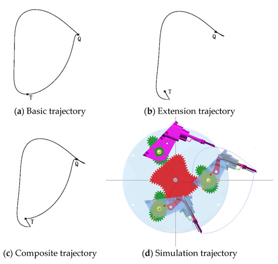 The working trajectory of the SPM is formed by the combined actions of the differential 2R non-circular gear system and the extension of the seedling needle, as shown in Figure 8. The differential non-circular gear system achieves the basic trajectory of the picking arm endpoint through the differential rotation between the non-circular central gear and the planet carrier, and the variable speed transmission between the non-circular central gear and the non-circular planet gears (shown in Figure 8a). Point Q represents the seedling-picking position, and point T represents the seedling feeding position. To enhance the seedling-picking success rate and ensure the integrity of the seedling pot matrix, this study designed a protruding seedling clamping device. At the picking position (point Q), the seedling needle extends into the seedling pot matrix to clamp the crop seedlings; at the feeding position (point T), the seedling needle retracts and exits the seedling pot matrix. The trajectory formed after the seedling needle extends is shown in Figure 8b, extending from point Q to retracting at point T, with the seedling needle maintaining the clamped state of the crop seedlings. The trajectory post-extension resembles the normal curve to the basic trajectory (from Q point to T point). By combining the basic trajectory with the extension trajectory, the working trajectory of the seedling needle endpoint can be obtained, as shown in Figure 8c. From the working trajectory of the seedling needle endpoint, it is evident that the SPM sequentially completes the processes of entering the seedling pot matrix to clamp seedlings, transporting the crop seedlings from the picking position to the feeding position, exiting the seedling pot matrix to push seedlings, and returning. This cycle enables continuous seedling picking.
