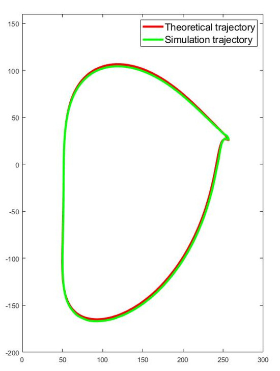 Import the established 3D model of the SPM into ADAMS simulation software (Version: R2020), establish constraints, and apply drivers to obtain the basic trajectory of the seedling-picking arm endpoint (as shown in Figure 8d). Comparing Figure 8a and Figure 8d, it can be seen that the simulated trajectory is basically consistent with the theoretical trajectory. The speed ratio between the non-circular center wheel and the planetary carrier of this SPM is 3:2. When simulating in ADAMS, the speed of the non-circular center wheel is set to 20°/s, the speed of the planetary carrier is set to 30°/s, the simulation time is 18 s, and the number of steps is 360. From this, 360 coordinate points of the trajectory can be obtained and plotted in Matlab. It can be seen that the simulated trajectory basically coincides with the theoretical trajectory (as shown in Figure 9). Export the coordinate points and compare them with the 360 coordinate points of the theoretical trajectory to obtain the trajectory accuracy, as shown in Table 4 (choose any 12 points).