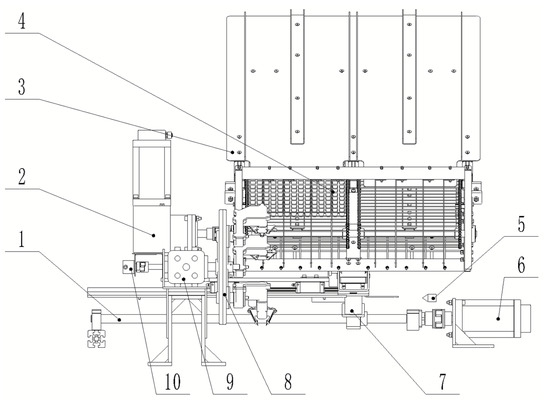 Schematic diagram of the test bench structure. 1. Lead screw, 2. vertical stepper motor, 3. seedling box, 4. seedling tray, 5. displacement sensor, 6. horizontal stepper motor, 7. lead screw nut, 8. seedling picking mechanism, 9. differential transmission box, 10. encoder.