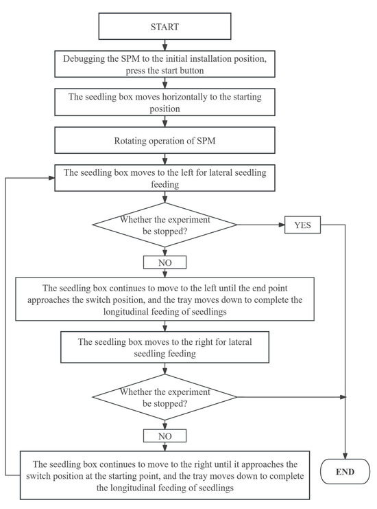 The automatic control logic flowchart is shown in Figure 11. When conducting the experiment, press the start button to activate the test bench. Initially, the horizontal stepper motor moves, driving the seedling box back to zero or the initial position. The initial position aligns the leftmost column of seed holes in the seedling box with the transplanting mechanism’s seedling clamps. Once the seedling box reaches this position, the transplanting mechanism starts rotating while the horizontal stepper motor moves the seedling box left. During this process, the transplanting mechanism repetitively performs the transplanting action. It is crucial to ensure that when the transplanting mechanism rotates to the seedling-picking point, the seedling clamps are precisely positioned in the middle of the seed hole. When the seedling box reaches the left limit, indicating that the row of seedlings has been fully transplanted, the end position switch sends a signal, the vertical stepper motor rotates a fixed angle to carry out vertical seedling feeding, and then the horizontal stepper motor moves the seedling box to the right to perform horizontal seedling feeding again. When the seedling box reaches the right limit, indicating that the row has been fully transplanted, the start position switch sends a signal, the vertical stepper motor rotates a fixed angle to perform another cycle of vertical seedling feeding, and the horizontal stepper motor drives the seedling box left for another round of horizontal seedling feeding. This cycle repeats continuously, with each mechanism operating according to the pre-set transplanting process. After pressing the pause button, all mechanisms on the test bench stop. Pressing the start button again resumes the operation from where it stopped. Pressing the emergency stop button immediately halts all mechanisms. After releasing the emergency stop and pressing the start button again, the horizontal stepper motor first moves, searching for the starting position of the seedling box. Once the seedling box reaches its starting position, it coordinates with the transplanting mechanism to continue the transplanting action according to the automatic operation program.