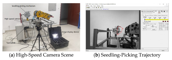 Based on the optimized mechanical parameters, the structural design of the SPM was completed, and a posture verification experiment was conducted on the SPM test bench. The experiment demonstrated that the designed SPM could successively perform processes such as extending the seedling needle, transporting, retracting the seedling needle, and returning. High-speed camera footage was analyzed to capture the seedling-picking trajectory and attitude, which were then compared with the trajectory and attitude calculations from the optimization design software. This comparison confirmed a high degree of consistency, mutually verifying the accuracy of both the optimization design software and the test bench experiment. The equipment used in this experiment was the I-SPEED3 high-speed camera. I-SPEED3 is a high-speed video camera launched by i-SPEED TR, Olympus Corporation, Tokyo, Japan. It is a microscope high-speed camera with a 1280 × 1024-pixel sensor capable of achieving a frequency range of 24 fps to 15,000 fps, ultra-high sensitivity, with a 1 μs full field exposure electronic shutter and a control panel CDU for remote device control (Figure 13).