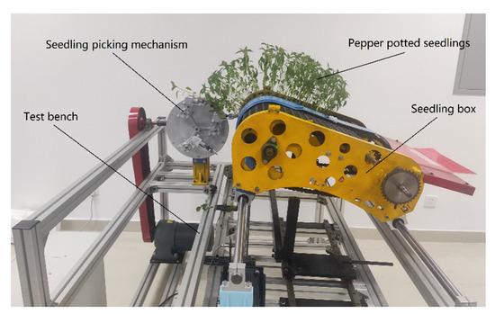 The seedling picking performance test was conducted using pepper plug seedlings as the transplant subjects, as shown in Figure 14. The experiment utilized the pepper variety “line pepper 8819”, which was cultivated in a specialized nursery matrix for fruits and vegetables (mainly consisting of peat, vermiculite, and perlite). At the time of the experiment, the seedlings were 47 days old, with an average height of 176.5 mm and an average stem diameter of 3 mm. The matrix’s relative moisture content was 45%, and the volumetric weight was 0.3273 ± 0.01 g·cm−3; the seedlings met the national technical standards for transplanting chili seedlings. The seedling tray used in the experiment was a 128-cell plastic tray (8 cells across and 16 cells down) with a pyramidal hole shape; the top of each cell was a 30 mm × 30 mm square, narrowing down to a 15 mm × 15 mm square at the bottom, with a depth of 40 mm. During the test, the SPM operated at a uniform speed, with the seedling box intermittently supplying seedlings horizontally and vertically. The test demonstrated that the three picking arms of the SPM could move sequentially according to the picking trajectory and attitude, alternately completing the clamping and feeding actions.