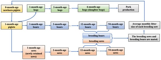In production practices, pigs undergo various growth phases throughout their life cycle. These stages are typically divided into months based on the pig’s age. Consequently, the month-age transfer of pigs is the procedure by which pigs transition from one growth stage to another. This paper uses the month age as the smallest time unit to accurately estimate the quantity of each category in the pig system.