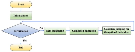 In 2020, Diep et al. [28] introduced SOMA T3A, which achieves excellent performance in solving 100-dimensional problems. However, SOMA T3A still faces challenges, such as unreasonable parameter settings and slow convergence speed. To address these shortcomings of SOMA T3A, we propose a modified self-organized migrating algorithm (MSOMA), based on SOMA T3A. MSOMA mainly consists of four steps, namely initialization, self-organizing, combined migrating, and Gaussian jumping for the optimal individual, as shown in Figure 2. The flowchart of MSOMA is as follows: