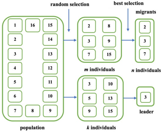 The way of organization determines which individuals are migrants and which individuals become possible leaders in the population. MSOMA follows the organization approach of SOMA T3A, namely, randomly choosing a subset of m individuals from the population, and then selecting the top n individuals from that subset to be migrants. The method employs a random selection process to choose a leader for each migrant. It begins by randomly selecting a small group of k individuals from the population, and subsequently designates the individual with the highest performance as the leader. The self-organizing process is depicted in Figure 3.
