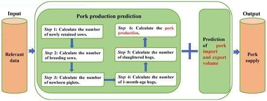 China, the most populated country in the world, plays a major role in both consuming and producing pork. According to the national consumption structure, pork accounts for 63.45% of total meat consumption. The recent decrease in pork supply and the significant fluctuations in pork prices have garnered considerable attention from various stakeholders [1]. Specifically, the advent of COVID-19 in early 2020 and the emergence of African swine fever (ASF) in 2018 have substantially reduced pork production in recent years. For different stakeholders in the pork supply chain, farmers and pork processing enterprises face the risks of reduced production and rising raw material costs, but they also benefit from the income increase brought by the rise in pork prices. Retailers and consumers face the risk of rising purchase costs; the government needs to take measures to ensure a stable supply in the pork market, stabilize pork prices, and strive to maximize social welfare. Pork demand has remained relatively stable, resulting in an imbalance between supply and demand, causing higher and more volatile pork prices. Therefore, it is critical to make precise pork supply forecasts in order to ensure consistent production and availability of live pigs, as well as steady pork supply and prices. The forecasting of pork supply is not just a systemic concern for the entire swine industry but also a socio-economic concern linked to people’s well-being. Furthermore, ensuring a stable pork supply plays a crucial role in achieving food security, improving nutrition, and promoting the healthy and sustainable development of agricultural production and meat supply chains. A scientifically reliable pork supply prediction system also aligns with the zero-hunger goal proposed by the United Nations for Sustainable Development.