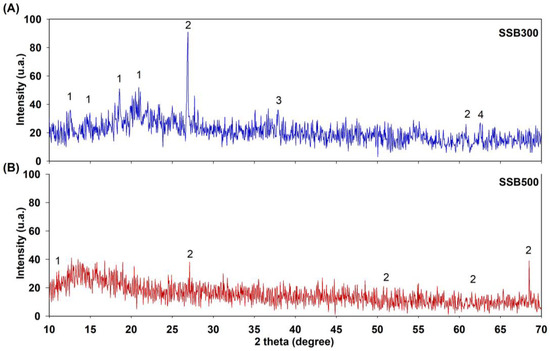 XRD was used to identify the crystal structures in SSB samples. The main phases in both SSBs tested herein were quartz (SiO2) and aluminum phosphate (AlPO4), although SSB300 also showed the presence of aluminum oxide (Al2O3) and sodium silicate (Na2SiO3) (Figure 1). The detection of AlPO4 indicated the stable presence of non-apatite P, which confirmed the effect of the AlSO4 used to precipitate P in the coagulation stage of the treatment that produced the SS used in this study. Additional characterization, thermogravimetric analysis (TGA) and differential thermogravimetric (DTG) and energy-dispersive (XRD) analyses were carried out in order to better understand the materials analyzed, and the results are presented in Figures S1 and S2.