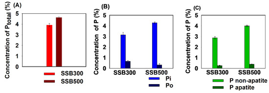 Sequential P extraction showed that SSB500 had a higher concentration of Ptotal than SSB300, at 4.64% and 3.92%, respectively (Figure 2), confirming that an increase in pyrolysis temperature favored the concentration of P in SSB500 [7]. Additionally, Pi was the predominant form of P in SSB, accounting for 80.6% and 92.2% of Ptotal in SSB300 and SSB500, respectively. In contrast, both SSBs had a low concentration of Po, although that of SSB300 was higher than that of SSB500 (0.67% and 0.32%, respectively). These results indicate that Po was partially converted into Pi during SS pyrolysis in a temperature-dependent manner, as previously reported [46].