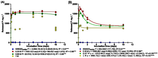 Release of P from sewage sludge biochar (SSB) over time in solutions of oxalic acid of increasing concentration. SSB300 (A) and SSB500 (B). *** indicates p < 0.001.