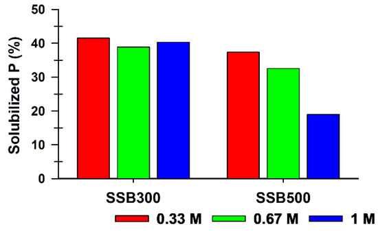 The oxalic acid solution promoted greater P solubilization in both SSB samples than that observed in the water-treated control, regardless of the concentration. Indeed, P solubilization was approximately 103 and 600 times higher in SSB300 and SSB500, respectively, than that in the control (Figure 3; Table S1). These results showed that the P forms present in SSB are insoluble in water but were effectively solubilized in acidic media. In fact, when the solution is acidic, both apatite and non-apatite P dissolve readily [47]. In addition, our results demonstrate that it is possible to use oxalic acid to increase the efficiency of SSB as a fertilizer.