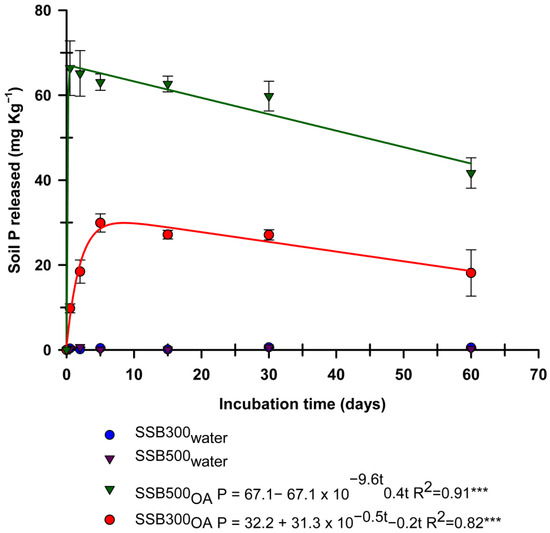 Release of P from SSB-treated soil over time (days) in the presence of oxalic acid (OA) or water. SSB300water and SSB300OA are sewage sludge biochars produced at 300 °C and treated with water and OA solution, respectively. SSB500water and SSB500OA are sewage sludge biochars produced at 500 °C and treated with water and OA solution, respectively. Error bars represent the standard deviation (n = 3). *** indicates p < 0.0001.