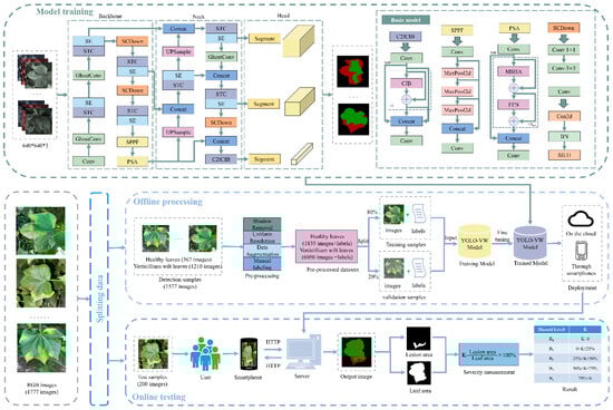 - The YOLO-VW model performs inference on the received image, first segmenting the cotton leaf and disease areas, then assessing the severity of CVW based on the ratio of diseased area to leaf area. The model outputs the assessment result, including the marked disease areas, confidence scores, predicted bounding boxes, and hazard level.