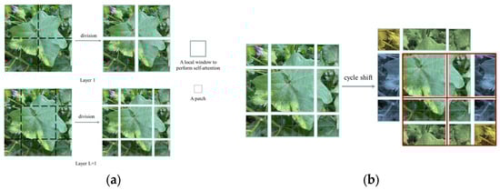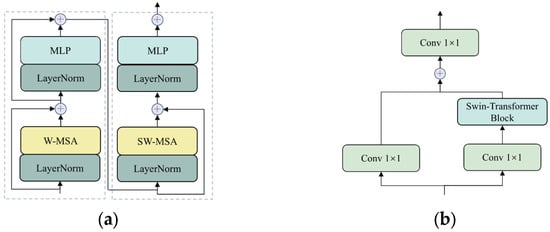 - In branch one, the input feature maps were sequentially passed through a convolution operation and two successive connected Swin Transformer Blocks. The Conv module used a 1 × 1 filter, mainly used for data dimensionality reduction. The Swin Transformer Blocks used the SW-MSA module to capture the connections between distant pixels to improve the model’s ability to perceive foliage, disease spots, and their margins. Enhanced information flow and global dependency capture.