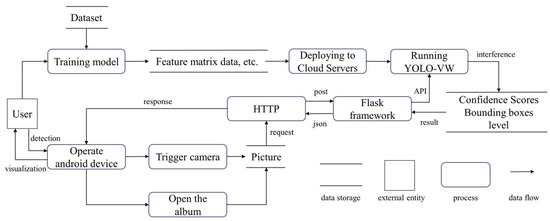 - The cloud server runs the Flask application, processes the request from the Android device, and invokes the YOLO-VW model.