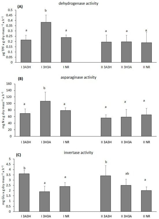 On site I, the highest dehydrogenase (DHA) and L-asparaginase (L-ASN) activity was found in the soil of plot I 3H3A, and it was significantly higher (p < 0.05) than the activity in the I 3A3H plot and the I NR plot (Figure 1A,B). No significant differences between the activity of these enzymes between the I 3A3H plot and the NR plot were noticed (Figure 1A,B).