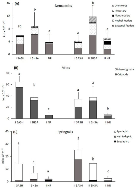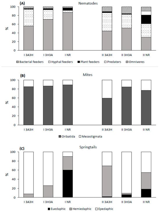 Relative abundance of (A) micro- and (B,C) mesofauna ecological groups at the reclaimed (3A3H, 3H3A) and non-reclaimed (NR) post-mine plots. For more information about the sites (I and II) and the reclamation practices, see Table 1.