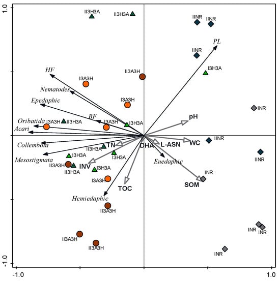 Principal component (PCA) ordination of soil properties and abundance of the soil fauna groups in the reclaimed (3A3H, 3H3A) and non-reclaimed (NR) plots. For more information about the sites (I and II) and the reclamation practices, see Table 1. Abbreviations: SOM—soil organic matter, TN—total nitrogen, TOC—total organic carbon, WC—water content, Bf—bacterial feeders, Hf—hyphal feeders, Pf—plant feeders, DHA, L-ASN, INV—soil dehydrogenase, L-asparaginase, and invertase activity, respectively.