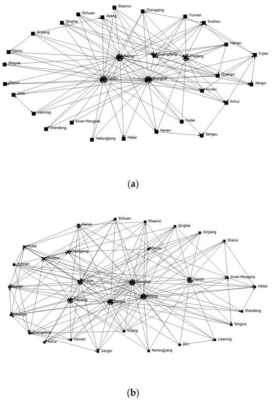 Spatial correlation network of China’s agriculture green efficiency in 2000 and 2022. (a) 2000. (b) 2022.