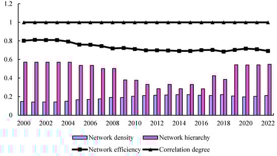 Structural characteristics of the overall network of China’s agricultural green efficiency from 2000 to 2022.