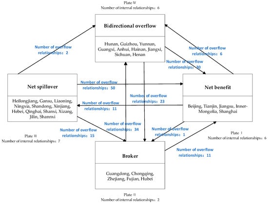 The interactive relationship between the four plates of the spatial correlation network of China’s agricultural green efficiency. (The blue font represents the number of spillover relationships between blocks).