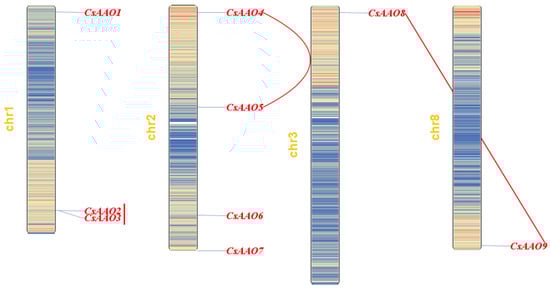 Chromosomal distribution of CsAAO gene family members. Pairs of segmentally duplicated genes are indicated by red lines.