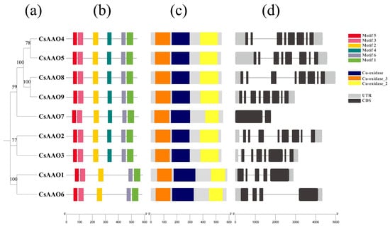 Phylogenetic trees, conserved motifs, conserved domains, and gene structures of CsAAOs in the C. sinensis. (a) The phylogenetic tree was generated by MEGA-X software using the Neighbor-joining (NJ) method. (b) Six conserved motifs of CsAAO proteins. (c) Conserved motifs of CsAAO proteins. (d) Gene structures of CsAAOs.