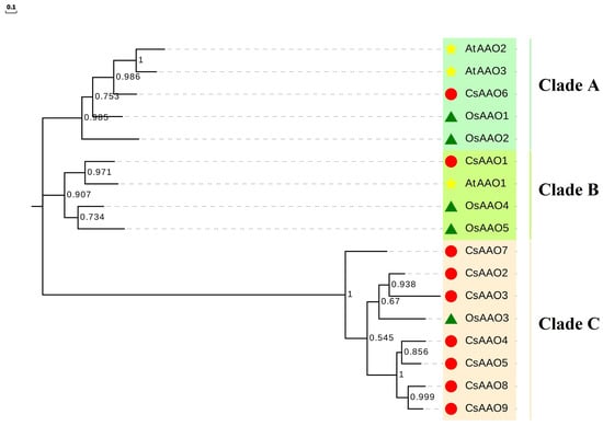 Phylogenetic analysis was conducted using 17 AAO predicted proteins from Citrus, Arabidopsis, and rice to construct an evolutionary tree (Figure 3). The resulting phylogenetic tree revealed that the AAOs were grouped into three distinct clades, with CsAAOs present in each clade. Specifically, CsAAO6 was assigned to Clade A, CsAAO1 to Clade B, and CsAAO2, CsAAO3, CsAAO4, CsAAO5, CsAAO7, CsAAO8, and CsAAO9 to Clade C.
