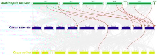 Phylogenetic trees were generated utilizing the Neighbor-joining algorithm in MEGA X software (https://www.megasoftware.net/, accessed 10 March 2023). The nucleotide substitution rates for nonsynonymous (Ka) and synonymous (Ks) mutations, as well as the Ka/Ks ratios of homologous CsAAO gene pairs, were determined using the simple Ka/Ks calculator in TBtools. Collinearity analysis between the genomes of Citrus and rice/Arabidopsis was conducted using the Multiple Systeny Plot in TBtools.