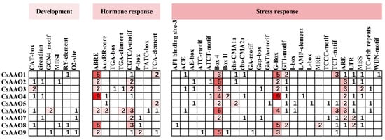 Cis-acting elements have been identified as crucial components in the control of gene expression [35]. In order to gain a deeper insight into the function of CsAAO genes and the mechanisms of transcriptional regulation, the cis-acting elements located within the 2000 base pair upstream regions of the translation initiation site were analyzed for nine CsAAO genes utilizing the PlantCARE software (Figure 5). The examination of cis-acting elements indicated that the promoter regions of CsAAO genes encompass 39 distinct types of cis-acting elements, which can be classified into three primary categories: development elements, hormone response elements, and stress response elements. Notably, stress response elements were found to be the most prevalent, comprising a total of 25 occurrences. Development elements primarily include meristem-specific elements (CAT-box), circadian regulation elements (circadian), and endosperm expression regulatory elements (GCN4_motif). Hormone response elements mainly consist of abscisic acid-responsive elements (ABREs), methyl jasmonate-responsive elements (CGTCA-motif), and salicylic acid-responsive elements (TCA-elements). Stress response elements mainly encompass light-responsive elements (Box 4, G-Box, etc.), anaerobic induction elements (AREs), and low-temperature-responsive (LTR) elements. Of note, the promoter region of some CsAAO genes contains unique cis-acting elements, such as wound-responsive elements (WUN-motif) in the CsAAO1 promoter and gibberellin-responsive elements (TATC-box) in the CsAAO6 promoter.