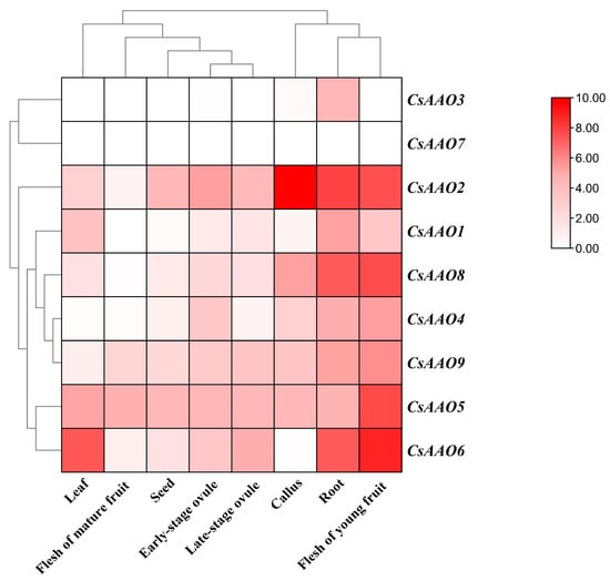 In order to elucidate the potential functions of CsAAO genes, an analysis was conducted on the available RNA-seq data from the Citrus Pan-genome to Breeding Database. The findings revealed that CsAAO gene expression displays tissue specificity, with CsAAO2 and CsAAO6 exhibiting notably high expression levels in various tested tissues such as leaves, seeds, callus, roots, early-stage ovules, late-stage ovules, young fruit flesh, and mature fruit flesh (Figure 6). Conversely, CsAAO7 was not detected in any of the eight tissues examined. Noteworthy is the observation that CsAAO3 was exclusively expressed in roots. Overall, the nine CsAAO genes demonstrated higher expression levels in roots and young fruit tissues.