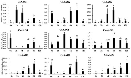Expression profiles of the CsAAO genes in response to cold treatment. Different letters indicate significant differences (ANOVA analysis, p < 0.05).