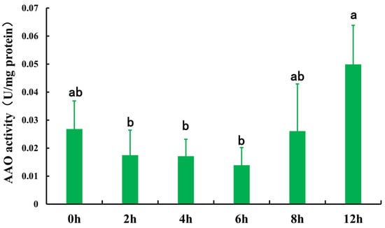 The AAO gene family is known to be involved in abiotic stress responses. Therefore, quantitative real-time polymerase chain reaction (qRT-PCR) was conducted to assess the transcript levels of AAO in response to low temperature treatment in order to investigate the ability of the CsAAO family to respond to cold stress. As depicted in Figure 7, the expression patterns of the CsAAO1, CsAAO3, CsAAO5, and CsAAO7 genes exhibit an initial increase followed by a decrease, whereas the CsAAO2, CsAAO4, CsAAO6, and CsAAO8 genes demonstrate a decrease followed by an increase. CsAAOs exhibiting a marked decline in expression from 0 to 2 h may experience a transient transcriptional repression as a consequence of the cold shock. The expression of the CsAAO9 gene shows a consistent upward trend. Noteworthy is the substantial upregulation of CsAAO1 by 42.4-fold at 2 h, CsAAO7 by 130.9-fold at 8 h, and CsAAO9 by 47.3-fold at 12 h compared to the control group. The observations revealed that CsAAO1, CsAAO5, CsAAO7, and CsAAO9 were implicated in the cold stress response of C. sinensis. Additionally, the activities of the CsAAOs demonstrated a pattern of initial decline, followed by an increase upon exposure to low temperatures (Figure 8).